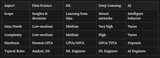 - Data Science (DS) → overlaps with all of them